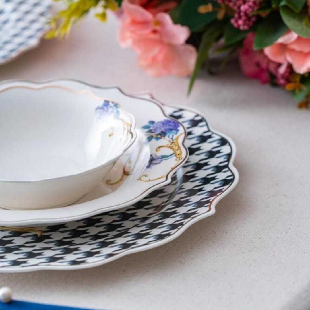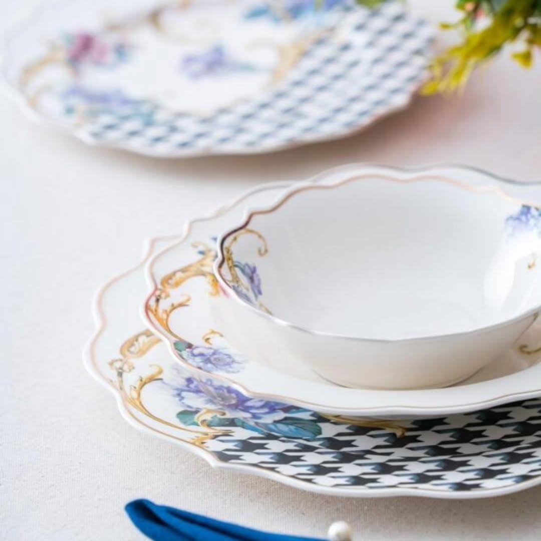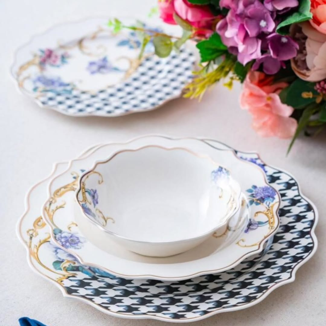 سرویس غذاخوری شام ۶ نفره و ۲۴ پارچه شامل: ۶ عدد پلوخوری، ۶ عدد سوپخوری، ۶ عدد پیاله و ۶ عدد پیشدستی. جنس چینی بن چاینا لبه طلاکوب.